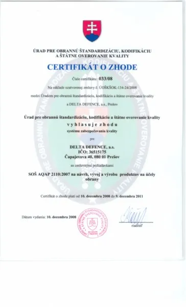 Slávnostného odovzdávania certifikátu sa zúčastnil za spoločnosť DELTA DEFENCE, a.s. predseda predstavenstva Ing. Jozef PARIČI.